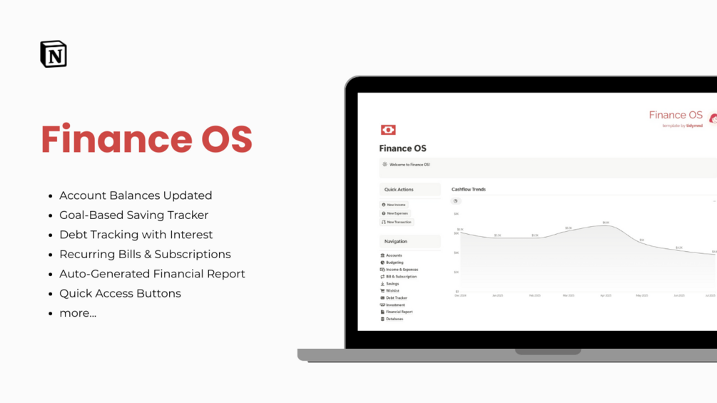 Finance OS is your all-in-one Notion system to manage income, expenses, budgets, savings, debt, and investments, in one calm, connected place.